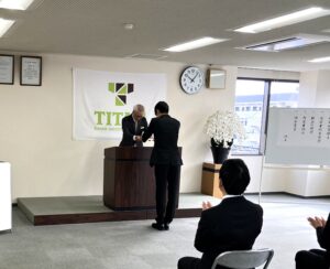 式典は、社長挨拶に始まり、内定証書授与、そして内定者代表挨拶と続きました。
